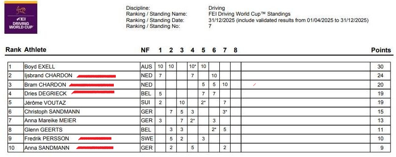 Rappel du règlement de la Coupe du Monde FEI d’attelage: Les 6 concurrents ayant totalisé le plus de point sur les 8 étapes de cette Coupe du Monde sont qualifiés (seuls les 3 meilleurs résultats sont comptabilisés sur 4 participations possibles).
