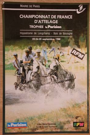 Du 25 au 27 septembre 1987 le Championnat de France se déroule au Bois de Boulogne. Plus précisément les chevaux sont logés dans les boxes de l’hippodrome d’Auteuil, le dressage et la maniabilité se déroulent au centre de l’hippodrome de Longchamp, le marathon se déroulant dans le bois sus nommé. Le maître d’œuvre de ce championnat est Alain Ducharme qui obtiendra que FR3 vienne filmer les concurrents sur le marathon. En 1988 le Championnat de France se déroule sur les mêmes lieux et c’est l’Association d’Attelage d’Ile de France et son président Alain Seguin qui seront aux manettes.