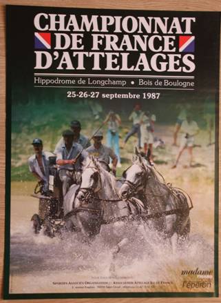 Du 25 au 27 septembre 1987 le Championnat de France se déroule au Bois de Boulogne. Plus précisément les chevaux sont logés dans les boxes de l’hippodrome d’Auteuil, le dressage et la maniabilité se déroulent au centre de l’hippodrome de Longchamp, le marathon se déroulant dans le bois sus nommé. Le maître d’œuvre de ce championnat est Alain Ducharme qui obtiendra que FR3 vienne filmer les concurrents sur le marathon. En 1988 le Championnat de France se déroule sur les mêmes lieux et c’est l’Association d’Attelage d’Ile de France et son président Alain Seguin qui seront aux manettes.